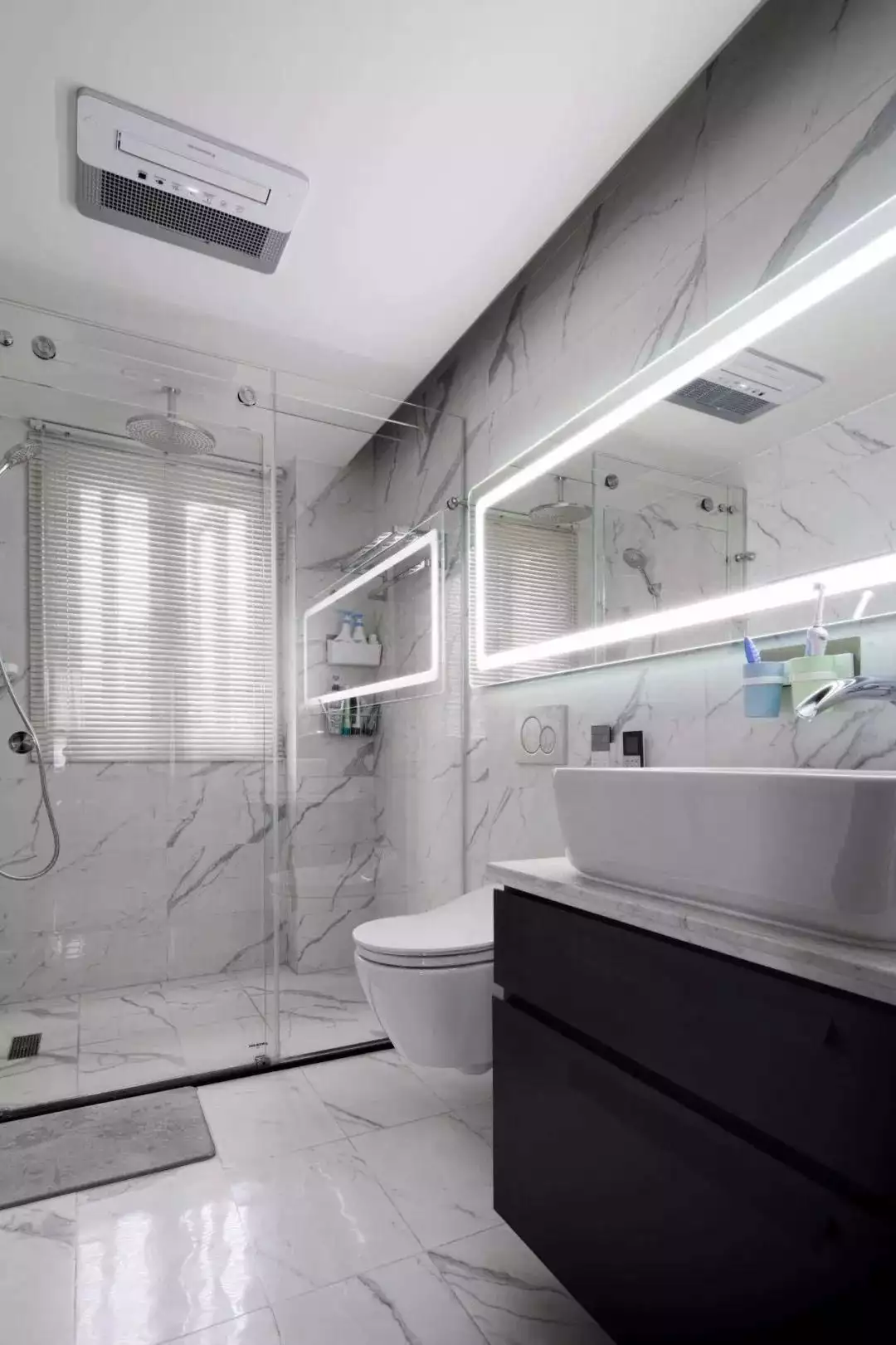 ▲卫生间雅白的地砖与墙面砖,搭配吊装的黑色洗手盆柜,台上盆上方的镜子加入光圈设计,让卫浴空间充满时尚现代的气质。