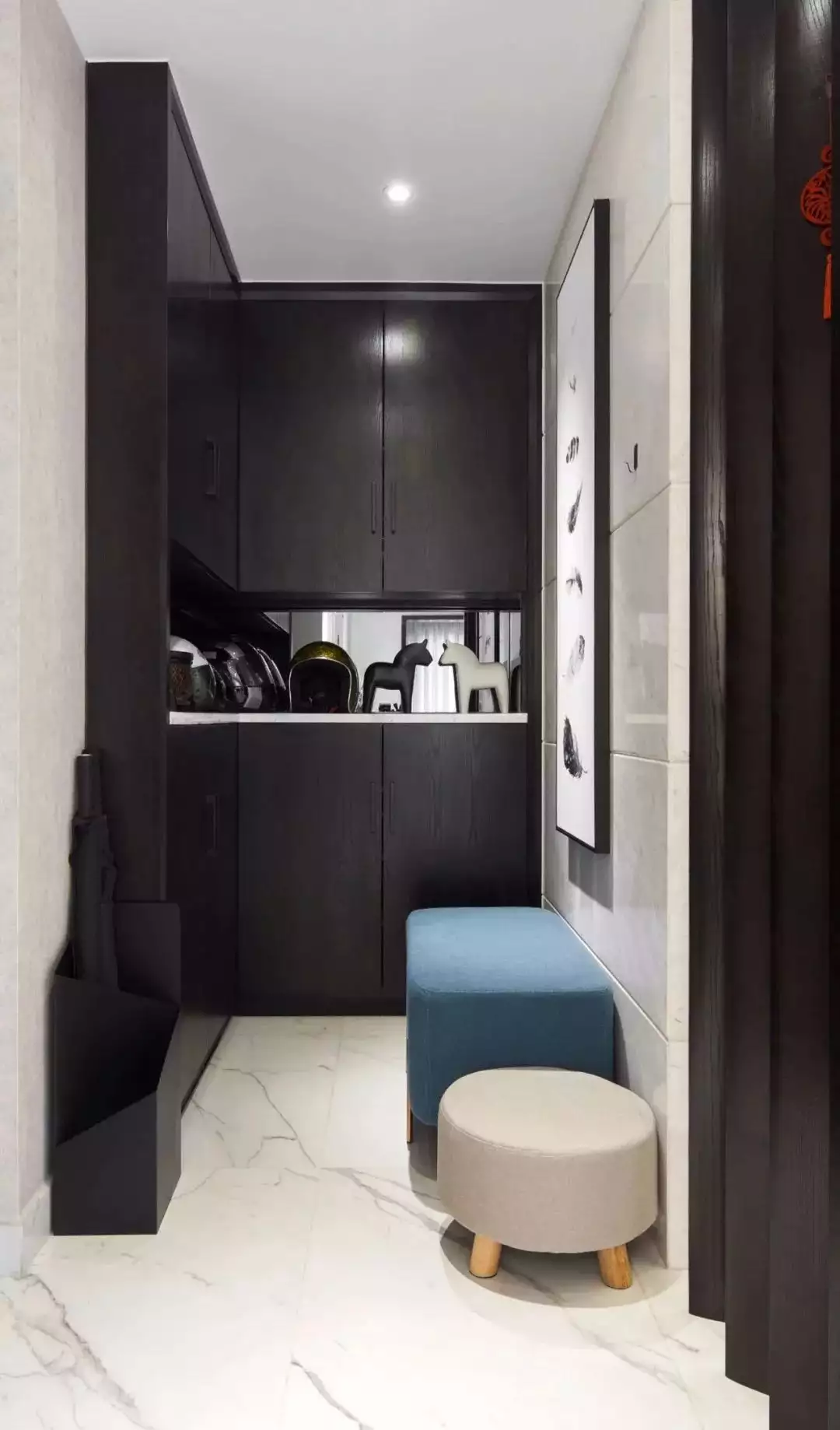 ▲玄关雅白的地砖+黑色鞋柜的组合,搭配蓝色与灰色的换鞋凳,鞋柜中间留空层上爱上黑白配的装饰品,让回家后的第一个空间显得实用而又端庄。