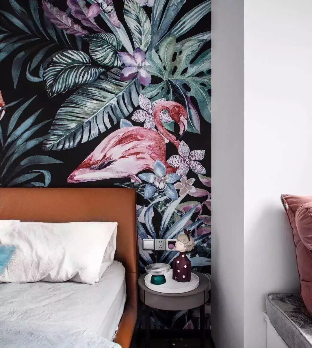 ▲次卧的床头墙是森系花纹的墙布,布置橙色的皮艺床,床头柜摆上花瓶与金属材质摆饰品,让次卧空间也充满文雅安静的惬意感。