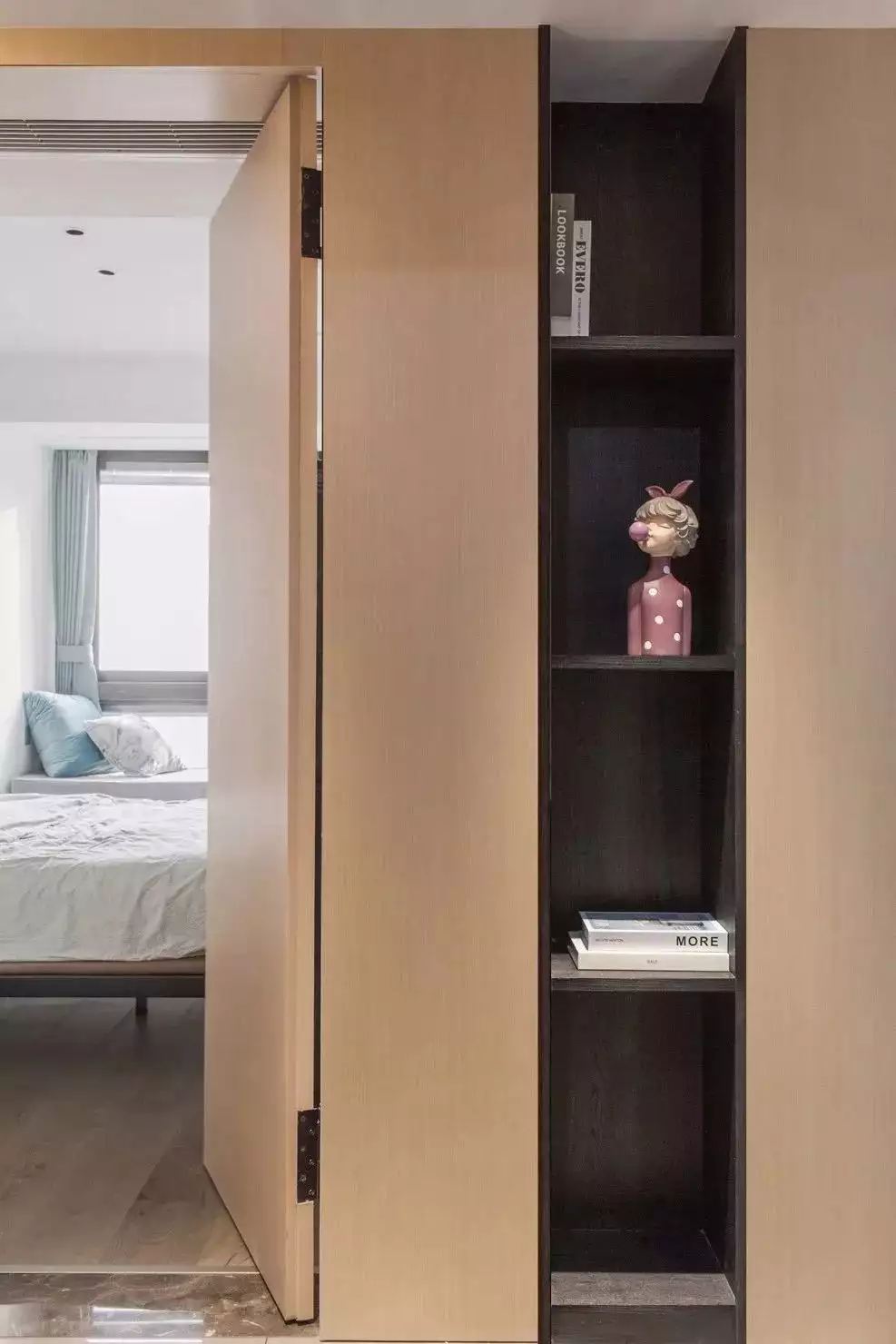 ▲在木饰面的墙面中藏入一扇隐形门,实现简洁美观的房门设计效果;侧边加入深灰色的开放格,摆上陶艺品与杂志,也让玄关空间显得更儒雅端庄大气。