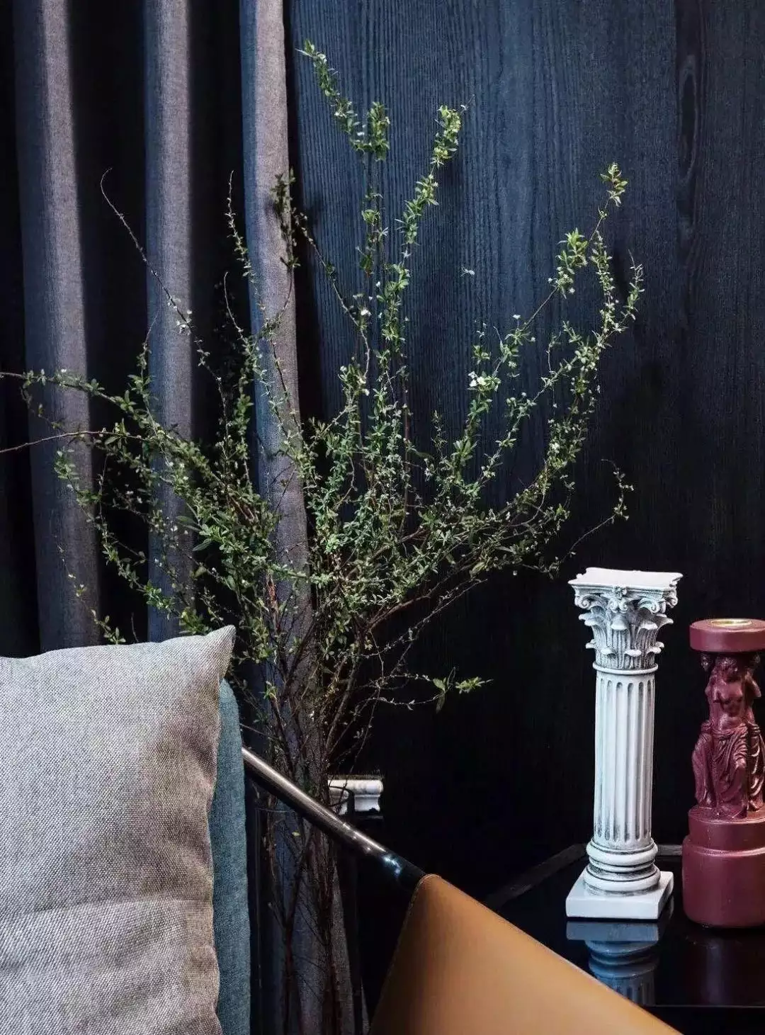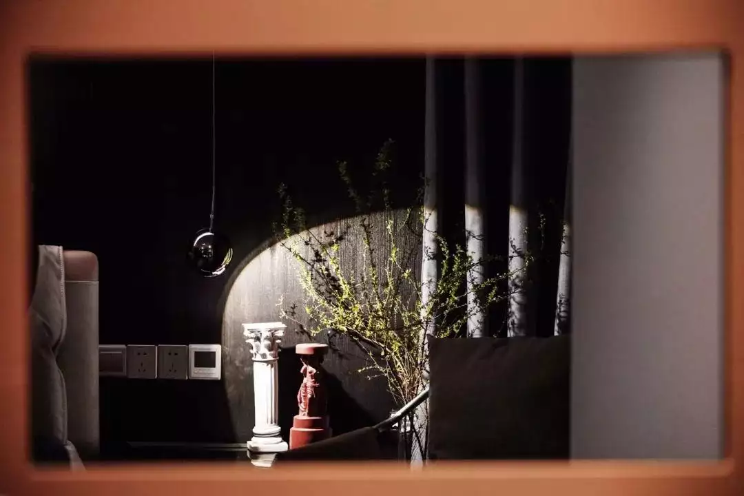 ▲床头柜上摆上艺术品、绿枝,以独特的吊灯照射,营造了一个层次优雅的角落空间。