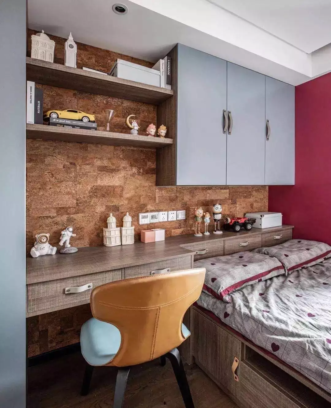 ▲书桌区域的墙面以软木板材质贴满,定制书桌的台面延伸到榻榻米床区域,尽管床头后的台面做小了点,但也能充当床头柜与台面辅助功能。