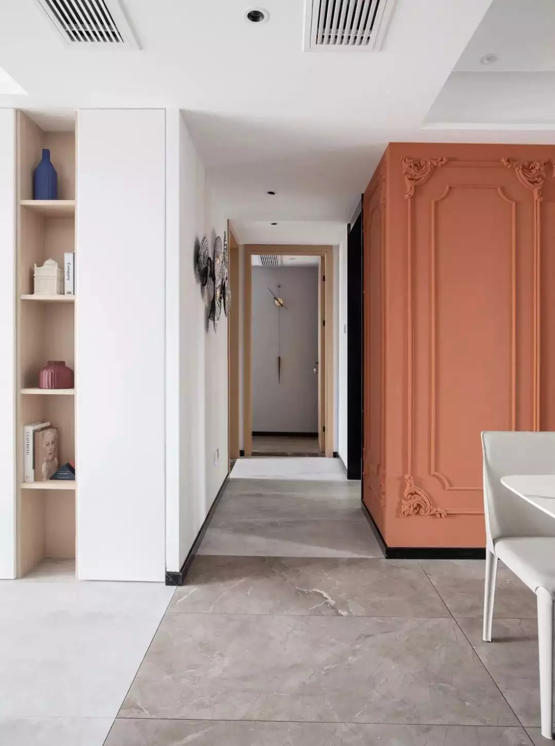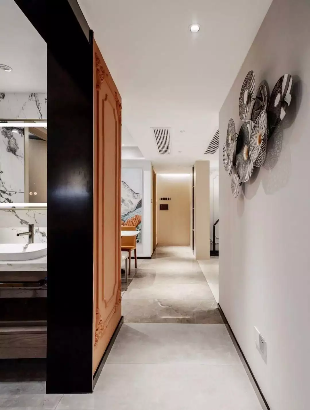 ▲过道经过客餐厅区域,连贯着玄关,过道右侧墙面挂一组装饰盘,左侧是橙色边框造型墙面+洗手盆外置过道的设计,做出一个实用与档次感兼具的空间布置。
