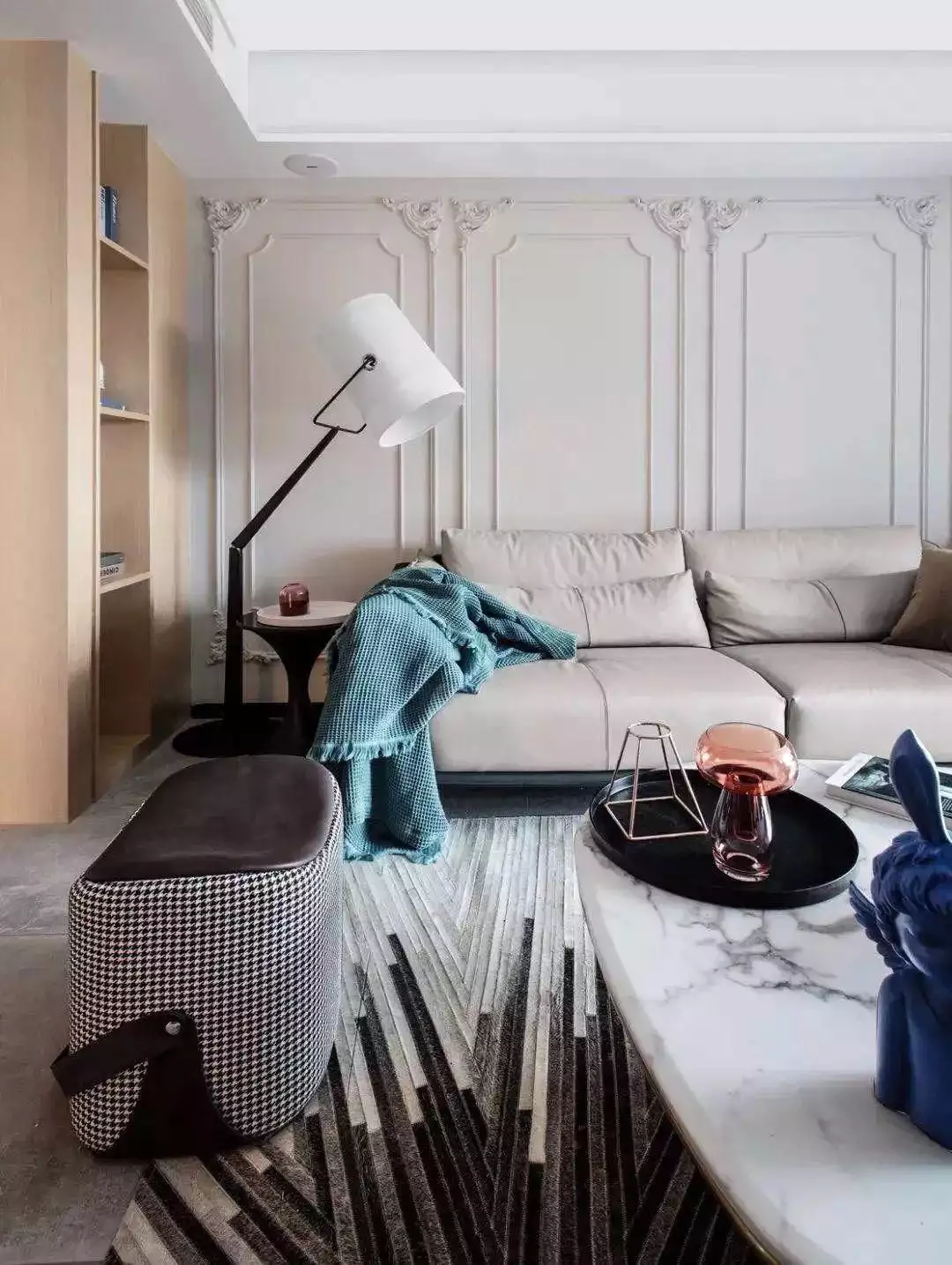 ▲沙发墙是带有简欧风浮雕造型的背景墙,布置一张灰色欧沙发,侧边边几+落地灯组合,加上岩板材质的茶几,精致现代的细节摆饰,让客厅空间充满现代优雅的高级感。