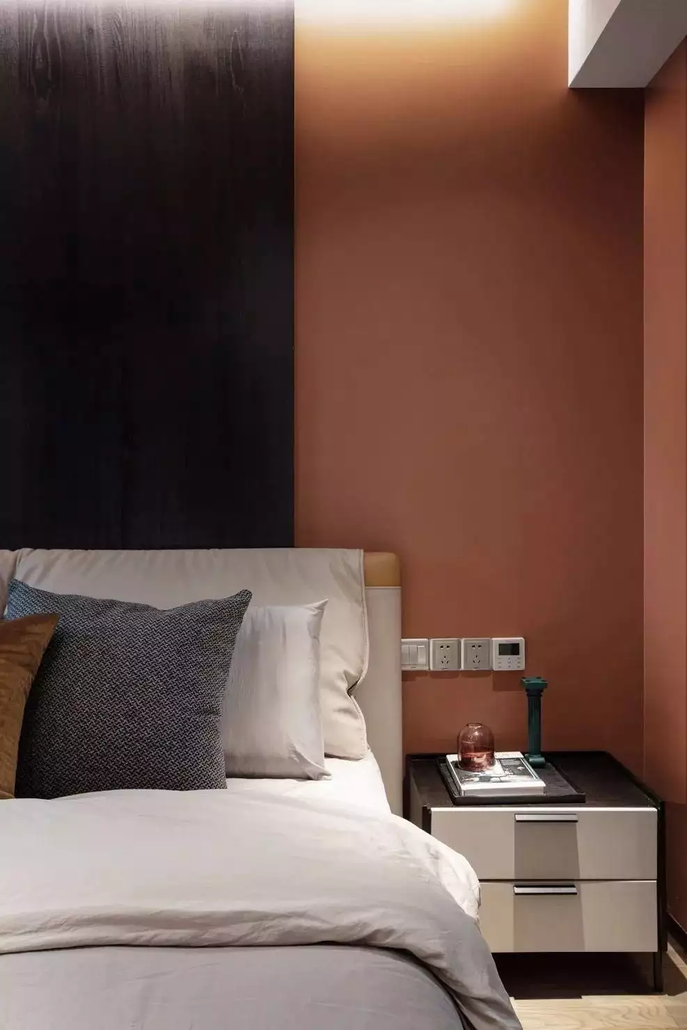 ▲卧室床头墙以棕褐色+黑色的拼色墙,布置米白色皮艺床,布置简洁素雅的床单,营造了一个端庄华丽、现代舒适的卧室空间。
