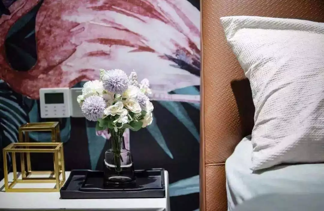 ▲圆形床头柜,摆上精致装饰品,在森系背景墙的图案下,显得格外的文雅自然。