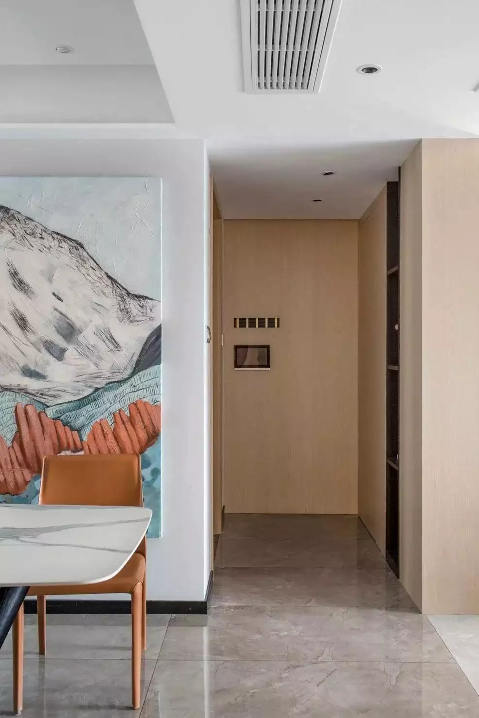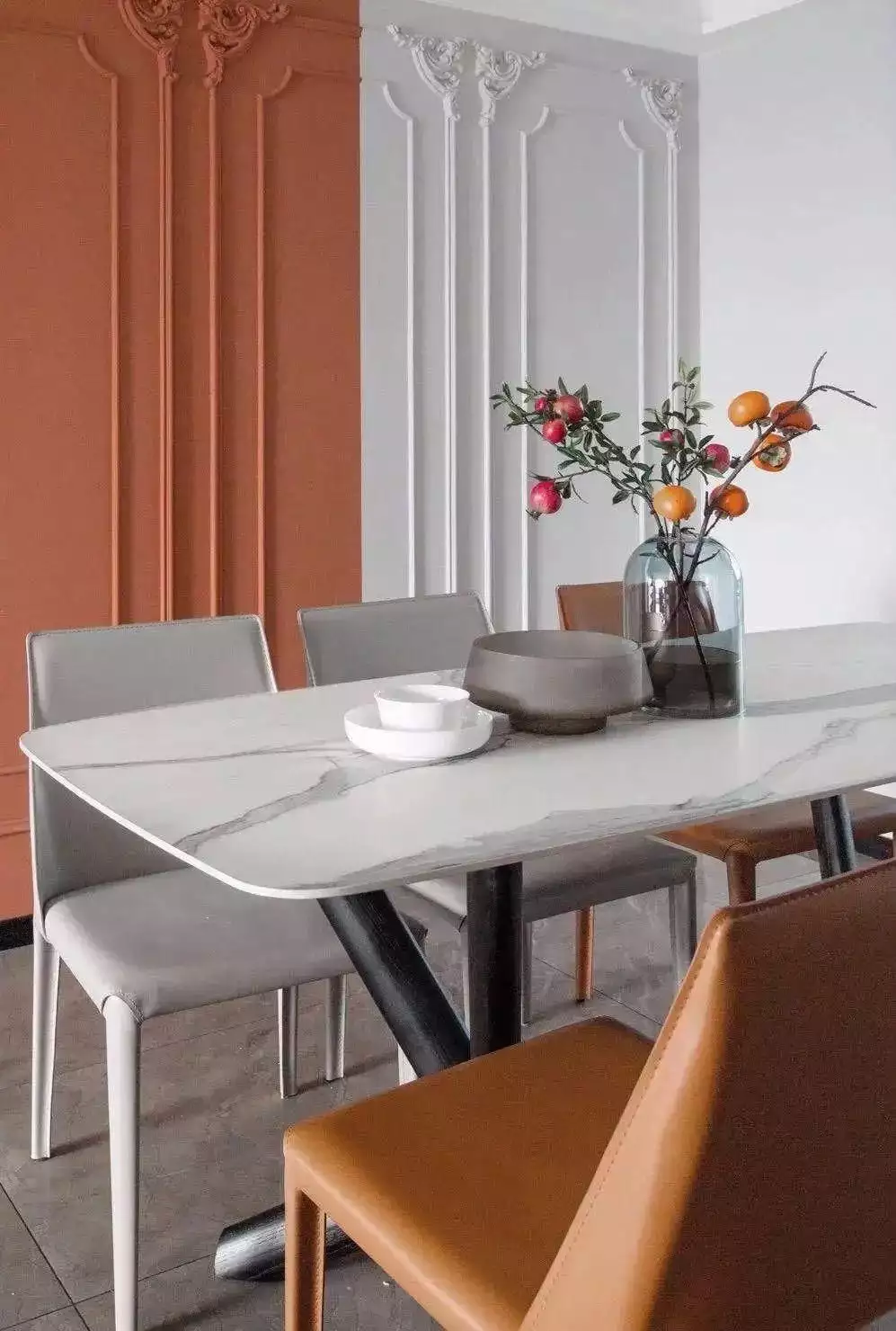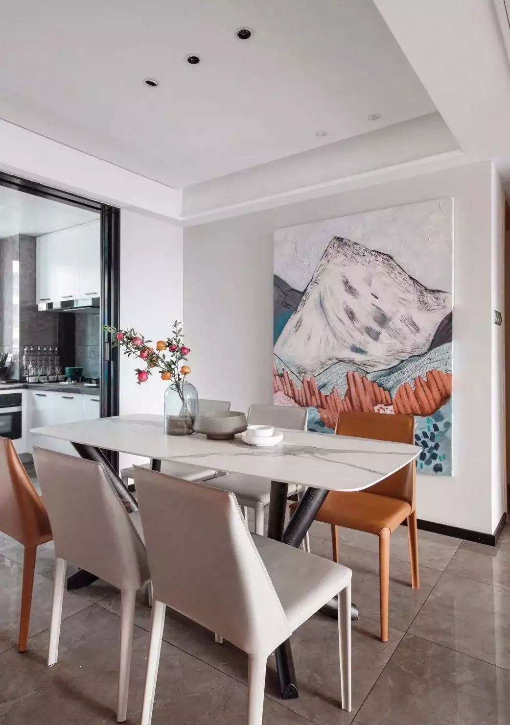 ▲餐厅布置一张黑色脚+白色台面的岩板餐桌,布置橙色+白色组合的皮艺餐椅,桌面上摆上玻璃花瓶与陶艺品,背景墙挂一幅山景抽象画,整个餐厅空间充满现代轻奢的高级优雅气息。