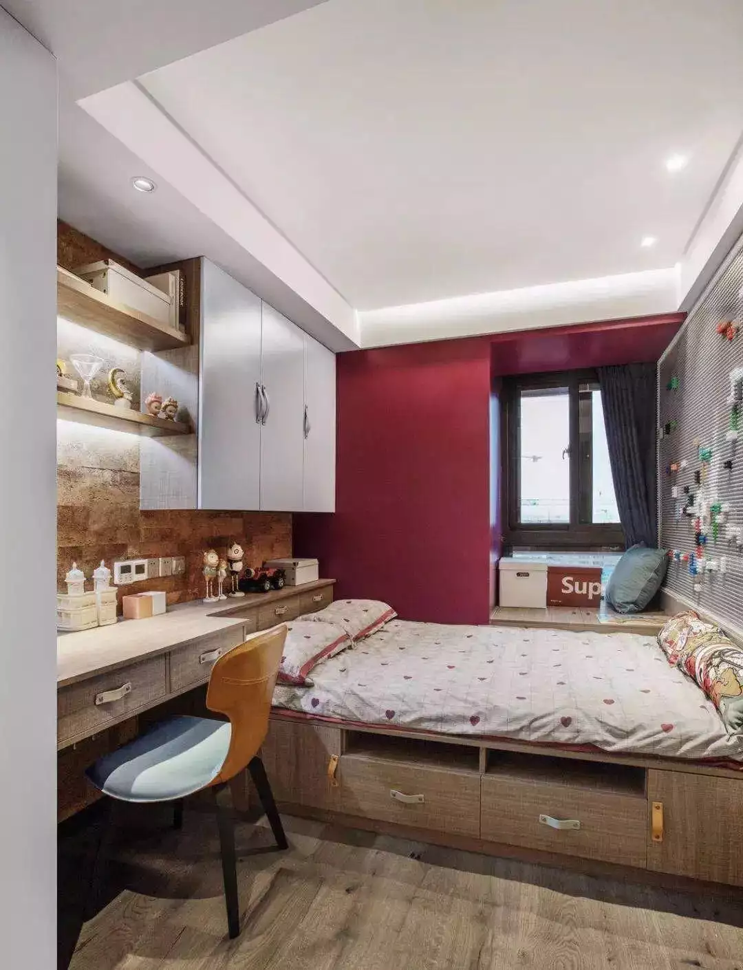 ▲儿童房定制榻榻米+书桌+吊柜与书架的组合设计,床尾装了一个积木板,飘窗侧边墙面是深粉红色的,搭配碎花图案的床单,营造了一个实用童趣的儿童房空间。