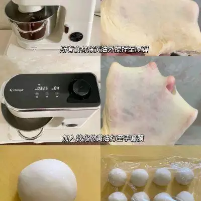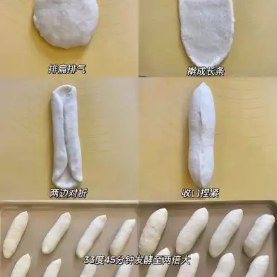 3、1除黄油和盐之外,其它材料全部放进厨师机 里,揉出厚膜 2加入黄油和盐,揉到展阶段,出手套膜 3面团平均分成4份,滚圆盖保鲜膜,松驰10分 钟 4取一个面团擀成长一点的牛舌状,再翻面卷起 来,捏紧收口,再搓长一点 5依次摆放到烤盘里,放进宜盾普蒸烤箱里发 酵,水箱里先装好纯净水,然后选择发酵功能, 20秒速出蒸汽,不用另外装碗热水放在旁边哦