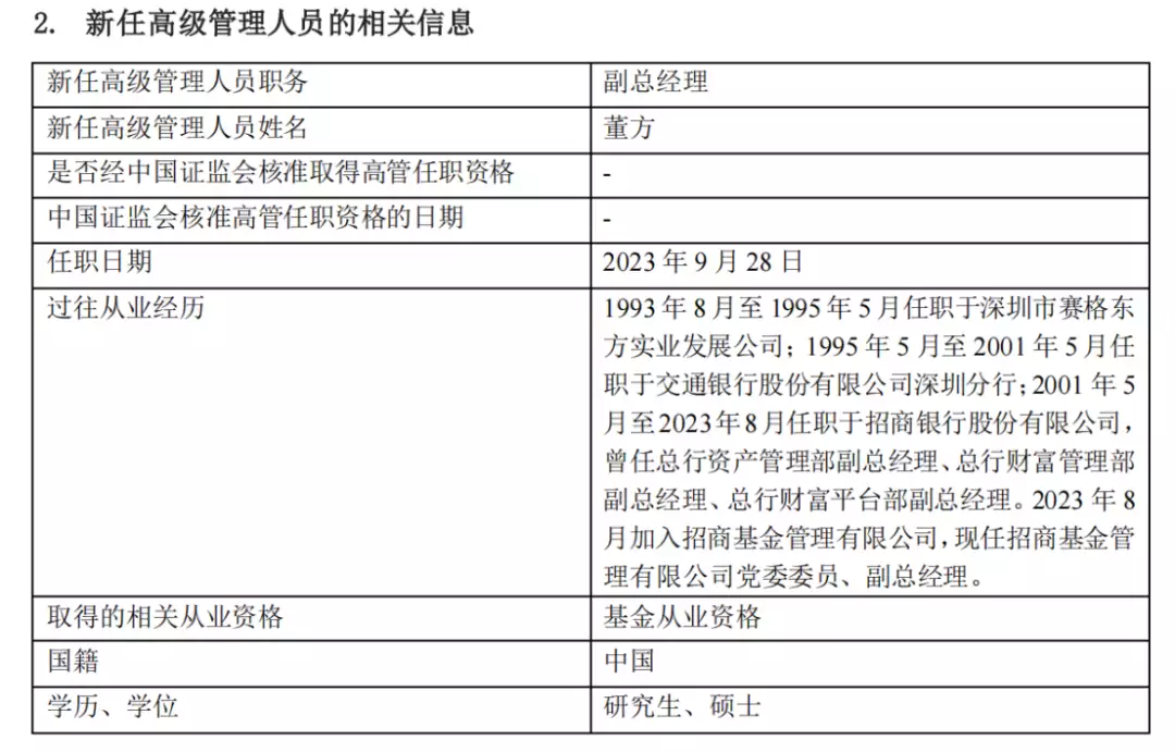 今日,招商基金发布高级管理人员变更的公告,任命董方为公司副总经理,任职时间是2023年9月28日。