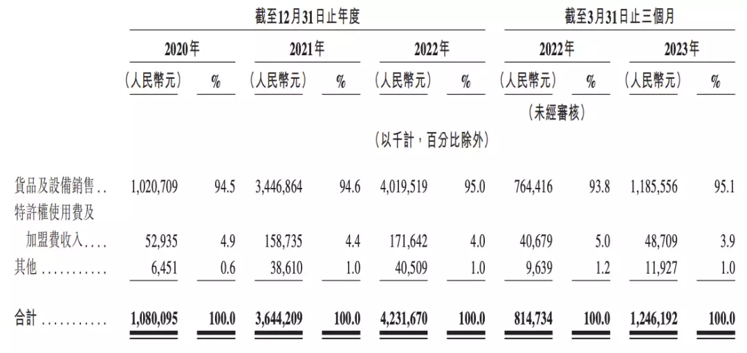 它的营收来源中,原材料和包材收入(向加盟商销售货品及设备)是绝对的大头,常年占比95%左右;加盟费收入(来自加盟商的特许权使用费及加盟费收入)只占5%。