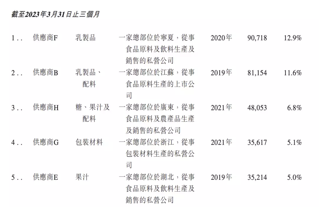 茶百道在招股书中列出了前五大供应商,每一年,它要拿出六成左右的收入,从供应商手里采购乳制品、茶叶、果汁等。