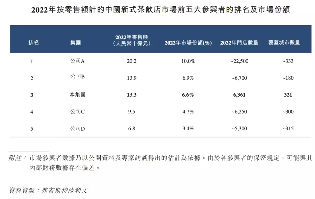 招股书引用咨询机构弗若斯特沙利文数据显示,茶百道在中国新式茶饮店市场中排名第三,2022年的门店零售额约133亿元,市场份额达到6.6%。「定焦」根据门店数量推测,前两名分别是蜜雪冰城和古茗。