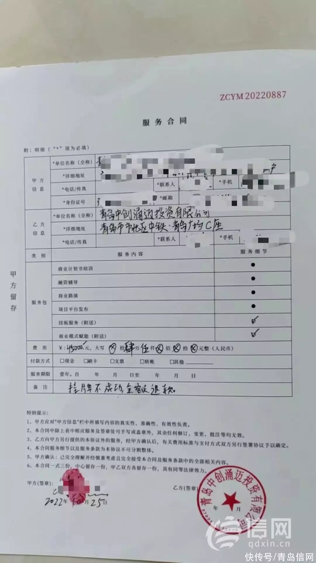 “他们不仅把装置描绘的很到位,而且还会制作立体3D效果的动画来展示,这样能提高申请专利的成功率。更重要的是,中创涌迈还承诺投资300万进行生产,帮我实现挂牌上市。”就这样,刘先生在2022年10月25日与中创涌迈签订了服务合同,中创涌迈提供商业计划书培训、融资辅导、商业路演、项目平台发布服务,并附送挂板服务和商业模式赋能服务,而刘先生则要支付45000元服务费用。合同签订当天,刘先生先支付了5000元,之所以这么痛快地交了钱,除了之前的承诺外,还因为合同备注里写着“挂牌不成功,全额退款”。