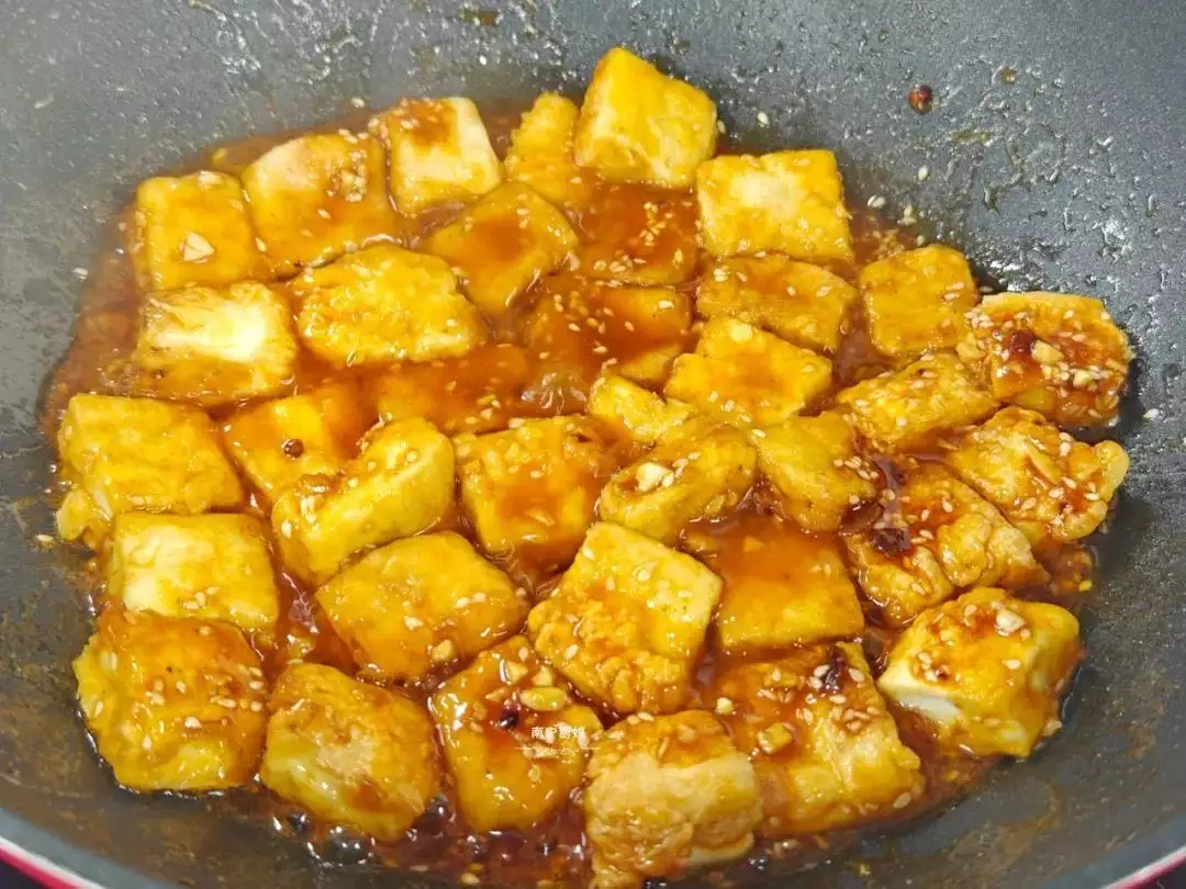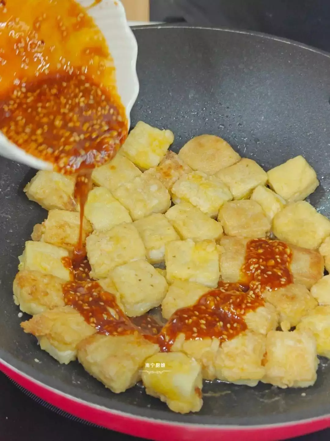 5、酱汁都调好之后,就可以直接淋在煎得金黄的豆腐上。