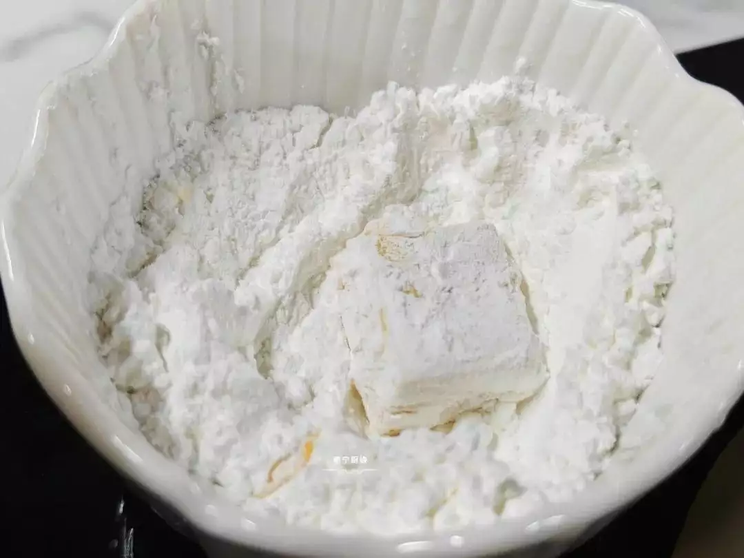 2、再准备另一个小碗,在碗里放入少量的面粉,再将裹上了蛋液的豆腐,放入面粉当中,让豆腐都沾上一层薄薄的面粉。