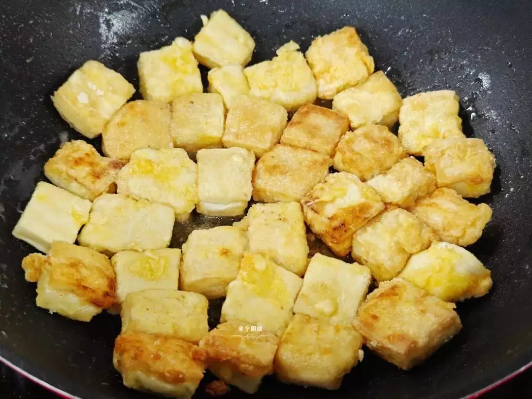 豆腐煎得金黄之后,外皮会带有一层层薄薄的酥皮,相当于给嫩滑的豆腐穿上了一件外衣。