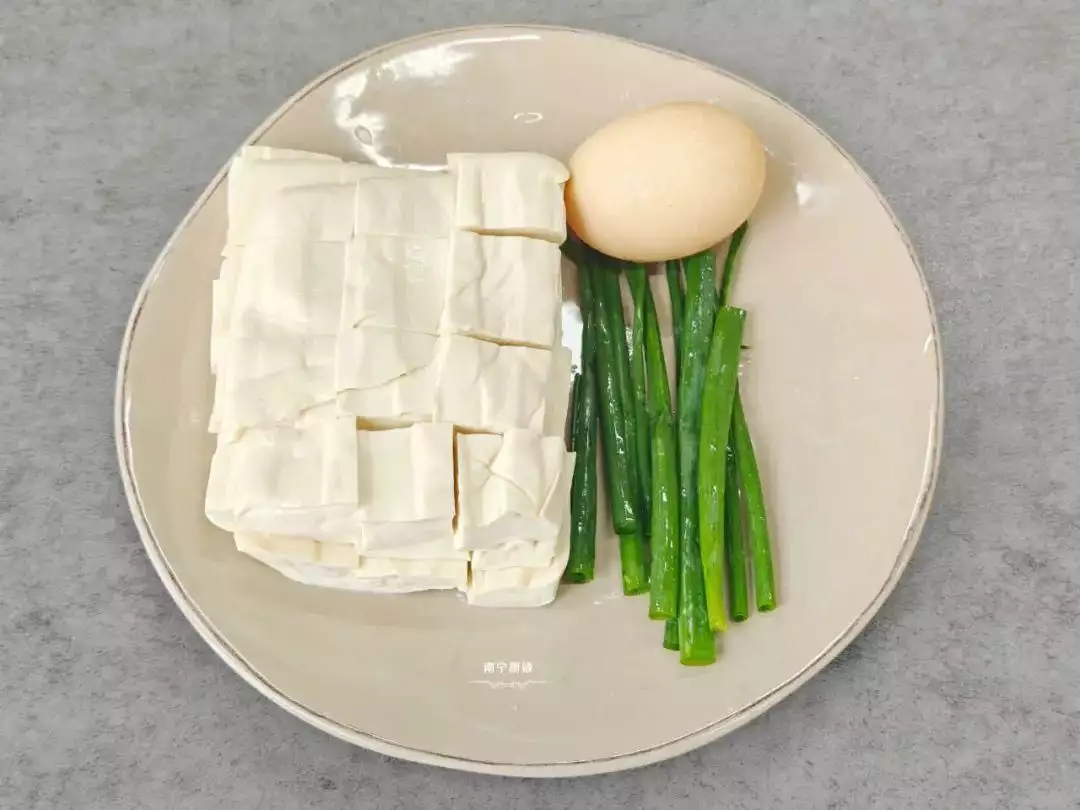 准备食材:嫩豆腐一块,青葱适量,鸡蛋1个。
