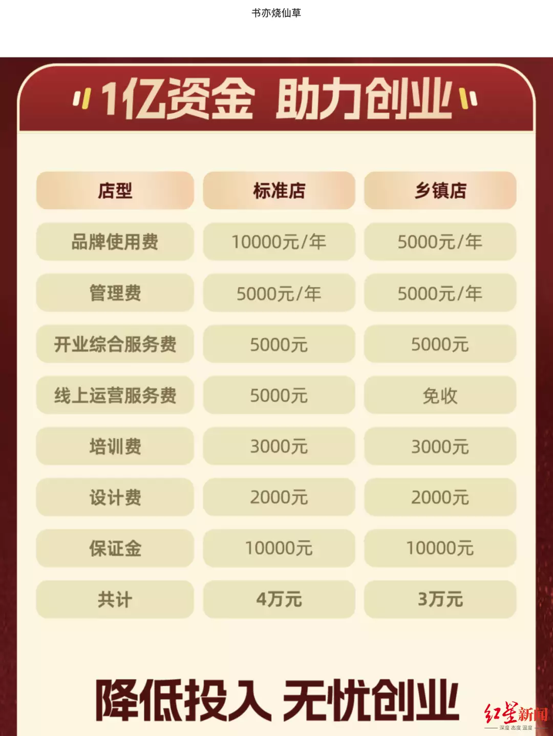 曾排行老二的书亦,应对方法是号称“最大力度让利合作伙伴,降低投入,无忧创业”,开拓更加下沉的乡镇店,且只需要3万至4万元的加盟费。