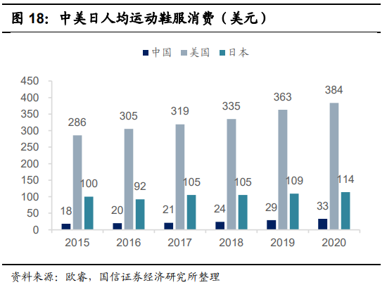 增长动能之“价”:运动鞋服消费升级带动平均销售价格的提升。得益于我国经 济的迅速发展和人们对运动鞋服文化潮流,功能性,创新性的追求,运动鞋服 的平均销售价格也在逐年攀升,2018 年运动鞋/运动服平均售价分别为 231.2/128.8 元,比 2014 年分别增加 26.9/16.5 元,并且随着体育消费的进一 步升级,这一数字在 2023 年有望达到 287.1/143.6 元。量价齐升,增长动能强劲,国内运动行业天花板高。运动鞋服行业的消费量和 消费单价均在迅速上升,带来行业的高景气度成长。2020 年我国运动鞋服人均 消费 33 美元,相比 2015 年增长幅度 83%,但一方面,我国人均消费距离美国 和日本分别有 11/3.5 倍的空间。另一方面,我国运动鞋服占服装行业的比例仅 12.5%,相比美国/日本/韩国的 31.8%/24.3%/25.7%处于低水平。未来在居民运 动参与度提升和体育消费升级双重因素促进下,国内运动鞋服行业还有很高的 天花板。