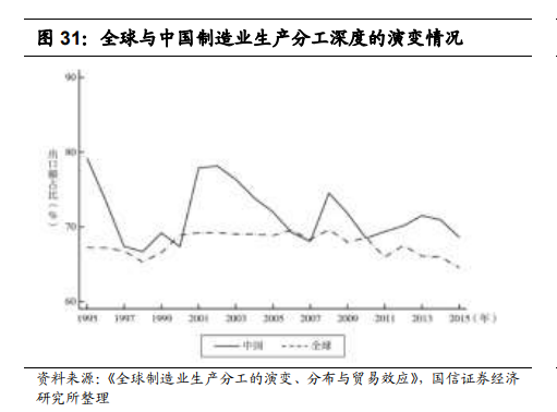 中国的产业结构发生变化,在全球的分工向中间阶段转变。以金融危机为分水岭,全球制造业分工深度先升后降,中国参与全球分工深度高于全球平均,但 2013 年以后深度逐步下降。中国出口最终阶段下滑明显而中间阶段占比提升,说明在参与全球分工的深度下降的背景下,产业结构发生了变化,中国制造业 在嵌入全球分工的过程中越来越向中间阶段转变。疫情催化供应链效率与安全的再平衡。据 2020 年 3 月中旬美国供应链管理协会对美国企业的问卷调查结果,36%的受访企业表示遇到了供应链破坏问题,28%的受访企业表示正在国际上寻找替代性的供应商(疫情初期该数值为 8%)。未来全球供应链从过去高度追求效率的全球分工,向逐步增大安全考虑的方向调整趋势有望持续。