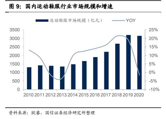 国家政府对体育产业的发展高度重视,2019 年我国体育产业规模为 2.95 万亿 元,2015~2019 年的年均复合增速 14.6%,政策指引 2025 年体育产业规模达 5 万亿元,因此 2019~2025 年在高体量下年均复合增速仍有望达到 9.2%。与此同时,政策指引经常体育锻炼人数和人均体育消费额的增加也将分别从量和价的方面一同带动运动鞋服行业的蓬勃发展,运动鞋服的消费需求将在国家政策大力支持下得到有效释放。