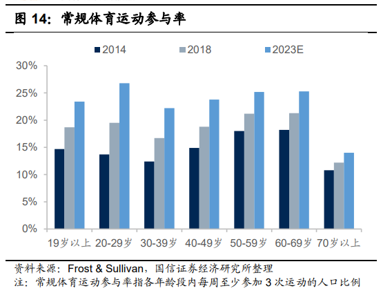 内因:多元化拓宽赛道,强大功能性+体育精神文化塑造产品力。传统体育项目如跑步、球类、游泳一直有着广泛的受众群体,随着人们收入提高,体育消费升级,更多年轻消费者开始追求高情操,刺激性和趣味性的体育运动,如瑜伽,滑雪,高尔夫,登山,攀岩。体育运动朝着多元化方向发展,赛道有望得到进 一步拓宽。与此同时,消费能力更强的消费者开始不满足于“物有所值”,更青睐于新潮,创新,功能性的产品。相比其他的鞋服类产品,一方面,运动鞋服品牌因其需要满足运动的轻便、弹性、保护等功能性需求,拥有更高的科技和研发壁垒。另一方面,运动鞋服品牌通过和体育赛事、顶级体育明星合作提升自身的社交属性和消费者认可度,同时融入本土运动精神提升自身的品牌文化,打造强大的品牌力。运动鞋服产品的功能性,社交性和品牌文化使其相比其他鞋服类产品具有更高的附加价值,因此能持续吸引并绑定中高端消费者,实现消费升级。增长动能之“量”:我国居民运动热情持续提高。伴随着大众消费生活水平提升, 健身运动意识增强,大型体育赛事的陆续开展,中国居民参与体育活动的热情在持续的提升。以马拉松为例,2015 年中国马拉松赛事仅举办了 134 场,而到 2019 年这两项数字分别达到了 1828 场和 712 万人的规模,呈现迅猛的增长势头。同时,居民健身也更加普及,2014-2018 年间中国健身俱乐部的数量和会员数量均以年均复合 15%左右的增速增长,到 2018 年全国健身俱乐部会员人数已达到 4750 万人。根据弗若斯特沙利文的统计,足球、篮球、乒乓球、跑步、健身步行等主流体育活动每一项现在在中国都拥有 2-3 亿人的受众。