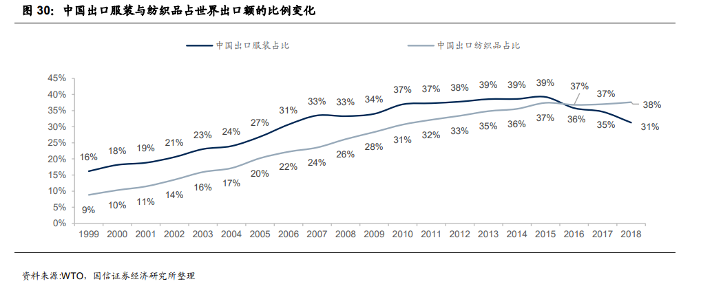 纺织服装产业链百年迁移,中国深度参与全球分工中国纺织服装产业链深度参与全球分工 ,在中间品与最终品出口上具备比较优势。蒋为等人在《全球制造业生产分工的演变、分布与贸易效应》的研究显示, 中国制造业大部分行业均深入嵌入全球生产分工中,并承担了中间阶段与最终 阶段的角色。气泡位置表示中国制造业在全球生产分工 中的生产阶段,而气泡的大小则表示出口规模。位于纵轴虚线以上和虚线以下 的行业分别表示在最终品出口和中间品出口中具有比较优势,位于横轴从左至 右表示该行业中间品进口的比较优势的程度的加大。通过观察发现,纺织、服装与皮革同时表现为最终品出口和中间品出口规模较 大的行业,其生产过程横跨了最终阶段与中间阶段,说明中国制造业在全球分 工中的专业化程度很高,而且生产链很长。服装/纺织品出口金额占世界的三成以上,1990 年开始,中国逐步成为“世界 工厂”,由于劳动力成本低、原料充足,纺织业发展迅速。21 世纪加入 WTO 与 配额取消加速中国纺织业发展,中国服装出口/纺织品出口占全球出口金额比例 持续扩大至 30%以上。目前,中国认为世界主要消费地欧美日的第一大进口国,且内需增长吸引产品回流近年东南亚国家增长较快但体量仍小,越南和印度在 6%左右,其余国家在 1%左右。