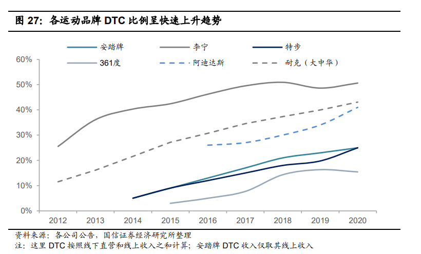 趋势展望:产品、渠道和供应链升级,国产崛起正在进行时趋势一:国产走中高端路线,崛起正在进行时本土公司通过功能性、国潮/时尚、收购进入中高端市场:(一)打造高功能性:耐克、阿迪达斯的高价值运动鞋往往具有强大功能,如 弹跳力,助推力,保护抗扭、减震等,本土品牌尝试通过打造强大的功能性提 升产品价值:1)李宁:目前公司的李宁 beng 科技已有一定的口碑,公司借助李宁 beng 科 技平台推出的高价值产品绝影、韦德之道、飞电等获得了消费者良好的反响。从价位段看,李宁 better & best 的销售占比超过 20%,部分产品甚至定价超过 1500 元。2)安踏:公司克莱·汤普森代言的 KT 系列篮球鞋持续升级,于 2020 年 9 月 推出 KT6,中底大包围结构是 3D HUG 稳定支撑模板,通过 TPU 包裹中底侧 面并延伸至鞋面,强化稳定性和抗扭力,同时加入大碳板,增强缓震和回弹性能,定价 899 元。公司于今年 4 月推出的 C202 GT 马拉松跑鞋拥有 NITROSPEEO NUC氮速科技和 A-FLASHFOAM 中底科技,搭配全掌 30 仿生足型碳板,具有舒适+专业的脚感,定价 1299 元。3)特步:特步从 2015 年品牌重塑开始调整定位,专注跑步领域的功能性投入, 最新推出的 160X PRO 和 160X 2.0,拥有全掌碳纤板、动力巢和减震旋等高科 技,针对专业马拉松选手,吊牌价分别为 1299 元和 999 元。(二)国潮/时尚特色文化:这一代 85 后、90 后见证了国内经济的高速发展和民族的崛起,会有较强的民族认同感和自豪感,因此通过国潮文化或文化融合等特色营销方式,从而获取年轻消费者、爱国消费者的认同,也是本土品牌走中高端的路径之一。1)安踏:2020 年 7 月,安踏借助东京奥运会和北京冬奥会契机推出国旗款系列高价产品,意味着消费者可通过正规渠道购买带有国旗的运动服饰。电商数据显示,在产品价位上,国旗款最高定价 2199 元,有超过一半的产品定价在 500 元以上,平均定价高于安踏其他产品 1 倍左右,位于中高端。今年起安踏国旗款有望逐步放量,开设国旗款店铺,并铺设销售国旗款的安踏大货店。2)李宁:2017~2018 年李宁通过纽约时装周推出时尚领域的中高端产品系列中国李宁,时装周以"悟道"为主题,围绕“心之悟”与“行之悟”两个篇章,将运动本身与中国传统文化、复古潮流融会贯通,同时意在实现古与今、中与西、 虚与实、功能与潮流的交汇融合。电商数据看到,21 年 4 月中国李宁近 50% 的销售额发生在 500 元以上的单价,20%在 900 元以上的单价。(三)收购海外品牌,进入中高端市场:由于本土品牌的产品力、品牌力相比 海外品牌仍然较弱,因此短期内难以定位中高端,而有资金实力的集团通过收购海外优质品牌走中高端路径是另辟蹊径的方式。1)安踏:收购多个海外品牌,已成功运营 FILA收购 FILA:2009 年收购中高端品牌 FILA,2012 年 FILA 知名度、商品、渠道 基本成熟,实现盈亏平衡。目前 FILA 流水规模接近 200 亿,经营利润率 27%, 30%的服装销售在 1000 元单价以上,成为安踏集团第二大增长曲线和中高端 产品线。丰富品牌矩阵:16~19 年,安踏分别收购高端专业运动领域的迪桑特、可隆、 AMER(所罗门、威尔胜、始祖鸟),把高端户外运动作为公司未来第三增长曲 线。新品牌迪桑特发展势头十分迅猛,目前流水规模 15 亿左右,经营利润率达 到 20%,可隆也已实现扭亏为盈。2)特步:尝试通过收购寻找第二增长曲线2019 年 3 月和 8 月特步通过合营或收购高端品牌索康尼及迈乐、盖世威和帕拉 丁,以主品牌为主线发展的同时,尝试通过收购寻找第二增长曲线。目前公司 的几个新品牌仍处于亏损状态,在运营方面,公司计划首先专注索康尼和帕拉 丁,稳步在国内开店,确保亏损可控,并适当更新和拓宽产品线,在保持品牌 高端调性的同时稳打稳扎地培养,通过几年的沉淀有望实现高增长。趋势二:直面消费者比例将继续提升DTC 指品牌商无需依赖分销商,可以直接向客户销售和交付产品。通过 DTC, 品牌商可以近距离获取消费者反馈和数据,以便更好使其营销和产品策略快速 响应市场变化和需求。2012 年国内运动行业的库存危机部分原因便是批发为主 的模式导致品牌商对零售端实际情况缺乏了解,反应不及时导致库存积压。顺应新时代的发展,各品牌商纷纷提出 DTC 转型升级或加盟直营化战略:1)耐克&阿迪:直击消费者,增强会员互动耐克:于 2017 年提出“直击消费者”战略,其中的“双倍与消费者联系”提到公司将进行数字化改革,重视线上运营和直营渠道搭建,了解消费者需求, 增强与消费者的直接互动关联,这一战略提出后,耐克的 DTC 占比从 2016 年 的 25.8%上升到 2020 年的 34.8%。阿迪达斯:在 2025 年的五年发展规划中,公司制定了扩大线上和 DTC 的发展 策略,指引 2025 年电商收入达到 80~90 亿欧元;DTC 业务占比从现在的 41% 进一步提升到 50%,贡献 80%的收入增长,halo 门店数增加为原来 2 倍,并 增设工厂店;加强与消费者的互动联系和绑定,会员数量从目前 1.5 亿增加到 5 亿人。2)安踏:主品牌回收 3500 家经销门店,大力度转型直营2020 年 8 月安踏品牌为打通人货场,深化会员价值运营,实现关键业务场景落 地和差异化会员运营策略,在中国 11 个地区开展直营转型模式,涉及 3500 家 门店,当中约 60%由集团直营,40%由加盟商按公司要求的标准营运,截至 21 年 Q1,回收直营工作已经基本完成。公司计划未来 5 年线上占比 40%,DTC 合计占比 70%,会员数量将提升 20%,会员贡献率达到