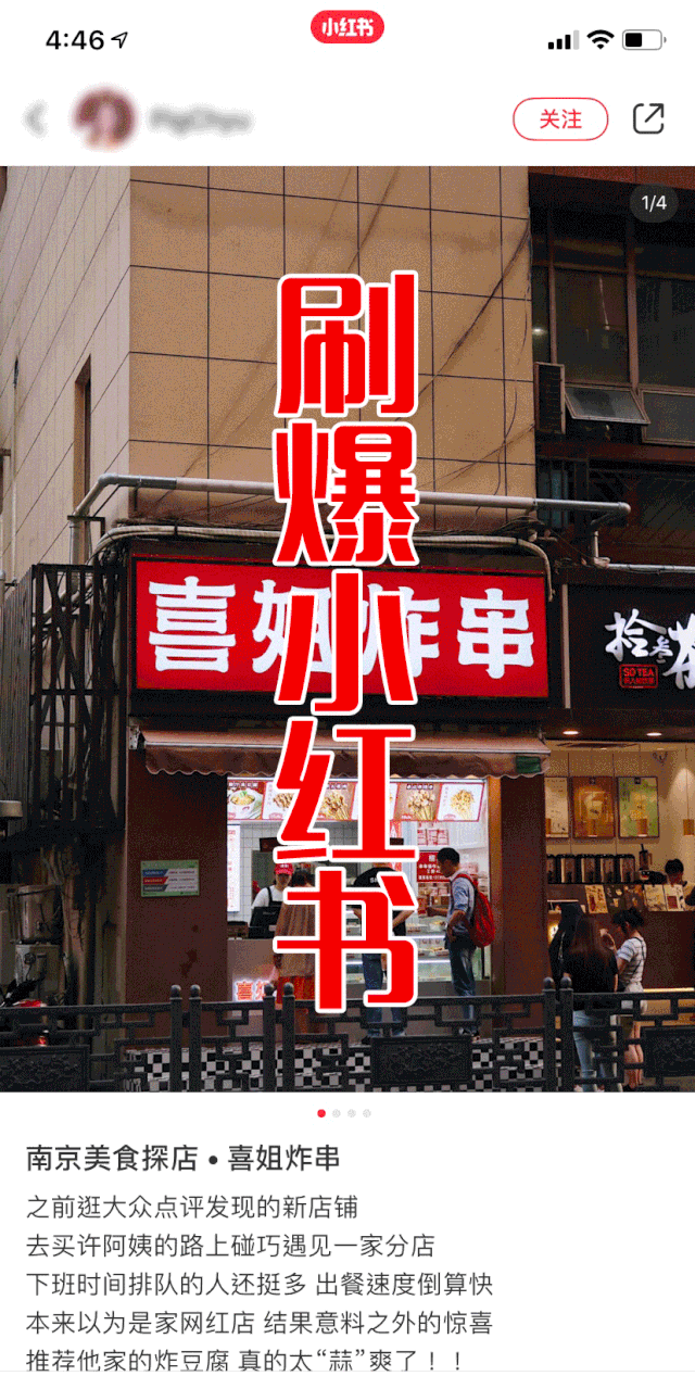 确定好品类,店名后就是店铺选址,喜姐炸串首家店选在南京新街口,新街口被称为亚洲第一商圈,是南京的流量入口。打造一个品牌,最快速的方法就是选择地标这一流量入口,因为人流量大,能很好的产生广告效应,毕竟在这样的地段租一个广告位的成本都非常的高。而将流量转化成销量将成为餐饮店成败的关键。这一位置后来被认为是喜姐品牌成功的黄金位置。3.门头:简单醒目
