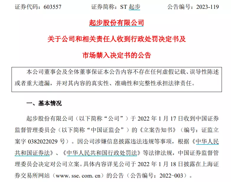 公告称,2022年1月17日,ST起步因涉嫌信息披露违法违规等事项,被证监会立案;2023年5月10日,收到证监会出具的《行政处罚及市场禁入事先告知书》;12月1日,收到证监会下达的《行政处罚决定书》。