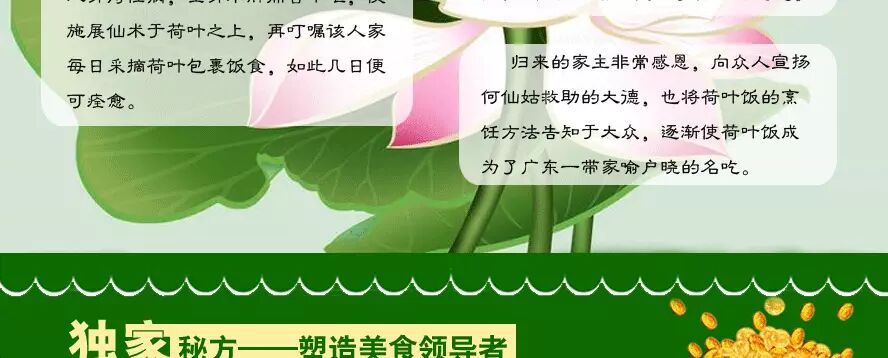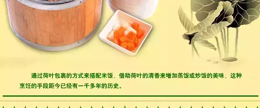 产品介绍:通过荷叶包裹的方式来搭配米饭,借助荷叶的清香来增加蒸饭或炒饭的美味,这种烹饪的手段距今已经有一千多年的历史。