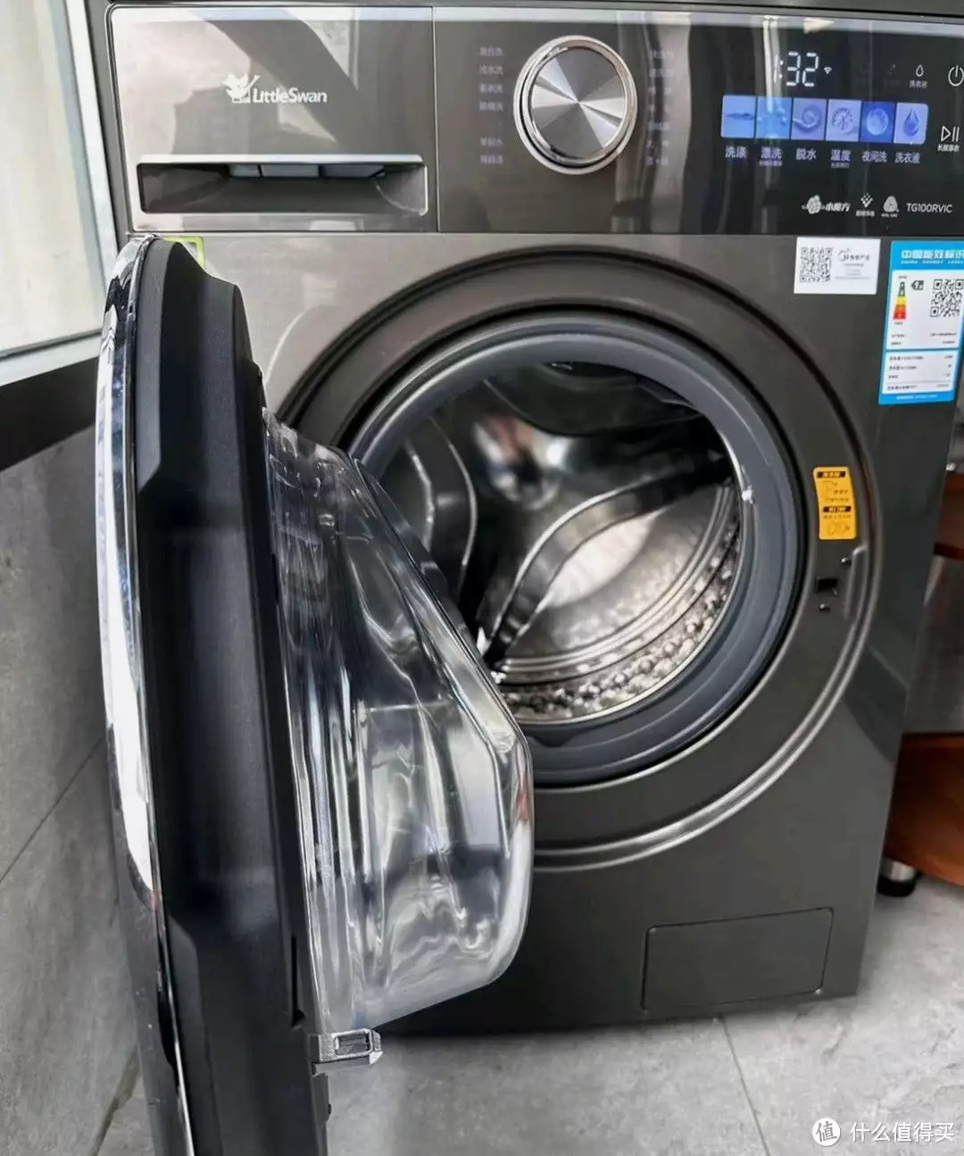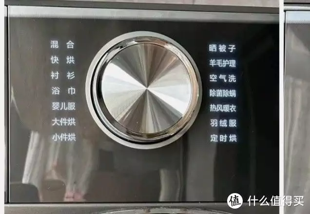 这是洗衣和干衣程序的主控旋钮,旋钮正面为金属镭射抛光饰面,侧边是水晶工艺包边,显得非常精致高端,旋钮转动时的阻尼感适中,程序选中准确,共包含洗衣、干衣程序各14个,涵盖了几乎所有的日常洗、干衣方式和衣物种类,基本上买到家,就相当于有了一个家庭级的洗护中心。