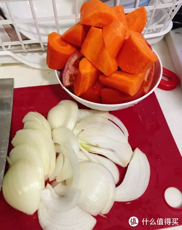 配菜 切切切 蕃茄三个,上好的胡萝卜一条,洋葱一个