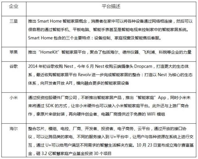 但是目前想做平台的大公司真是不少。如下图所示,京东从去年到现在已经布局智能家居一年, 推出“超级 App”为中心的京东 + 计划,整合其电商平台里可以加入到智能家居系统的各类家电、家居产品。阿里在去年就推出天猫魔盒产品,目前已经经历两次产品升级,10 月 27 日国内知名视频监控品牌大华股份发布旗下智能家居独立品牌“乐橙”,并宣布与阿里云在云计算、大数据等领域展开战略合作。