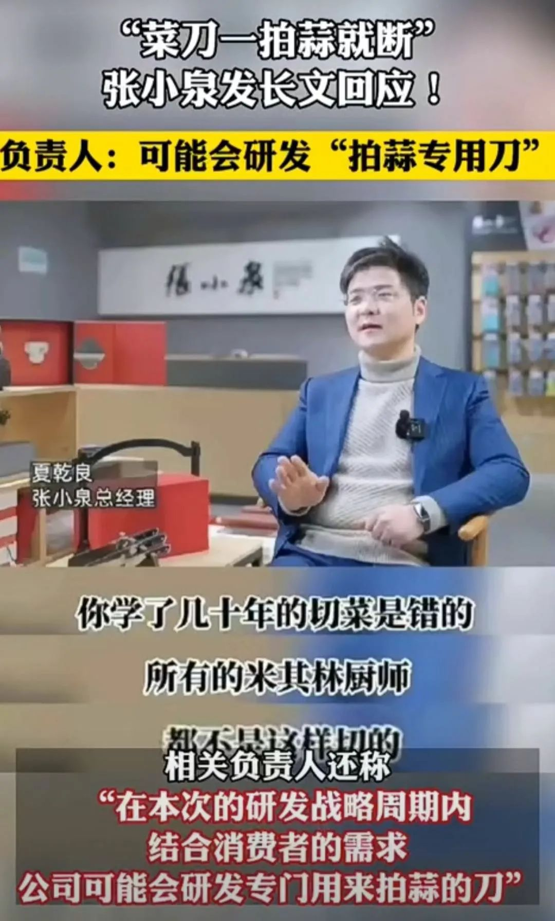 有网友使用张小泉的刀拍蒜时刀居然断了,结果客服回复说「刀不能拍蒜」,后来张小泉总经理在一次采访中说:“中国人切菜方法不对,我们在做消费者教育”,这则短视频刷爆全网。