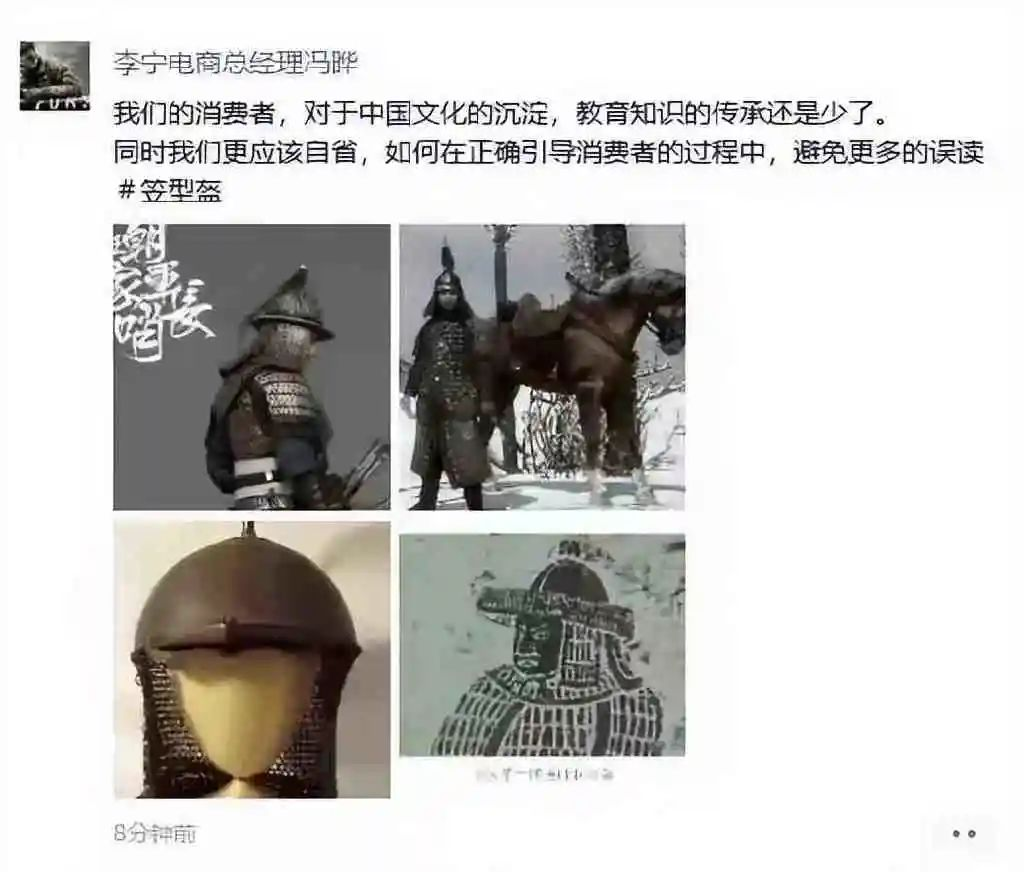 并打上#笠型盔的标签和图片,说明新品设计灵感来源于中国古代服饰。简单概括下:第一,你误会我了;第二,你文化少多读点书。网友们情绪正上头呢,猛不叮地被上了一课,你这是在教育我做事呀。李宁集团执行董事、非凡中国体育CEO李麒麟则在微博上连发五张图,分别是类似帽子设计的图片,但他随后删除了该微博。