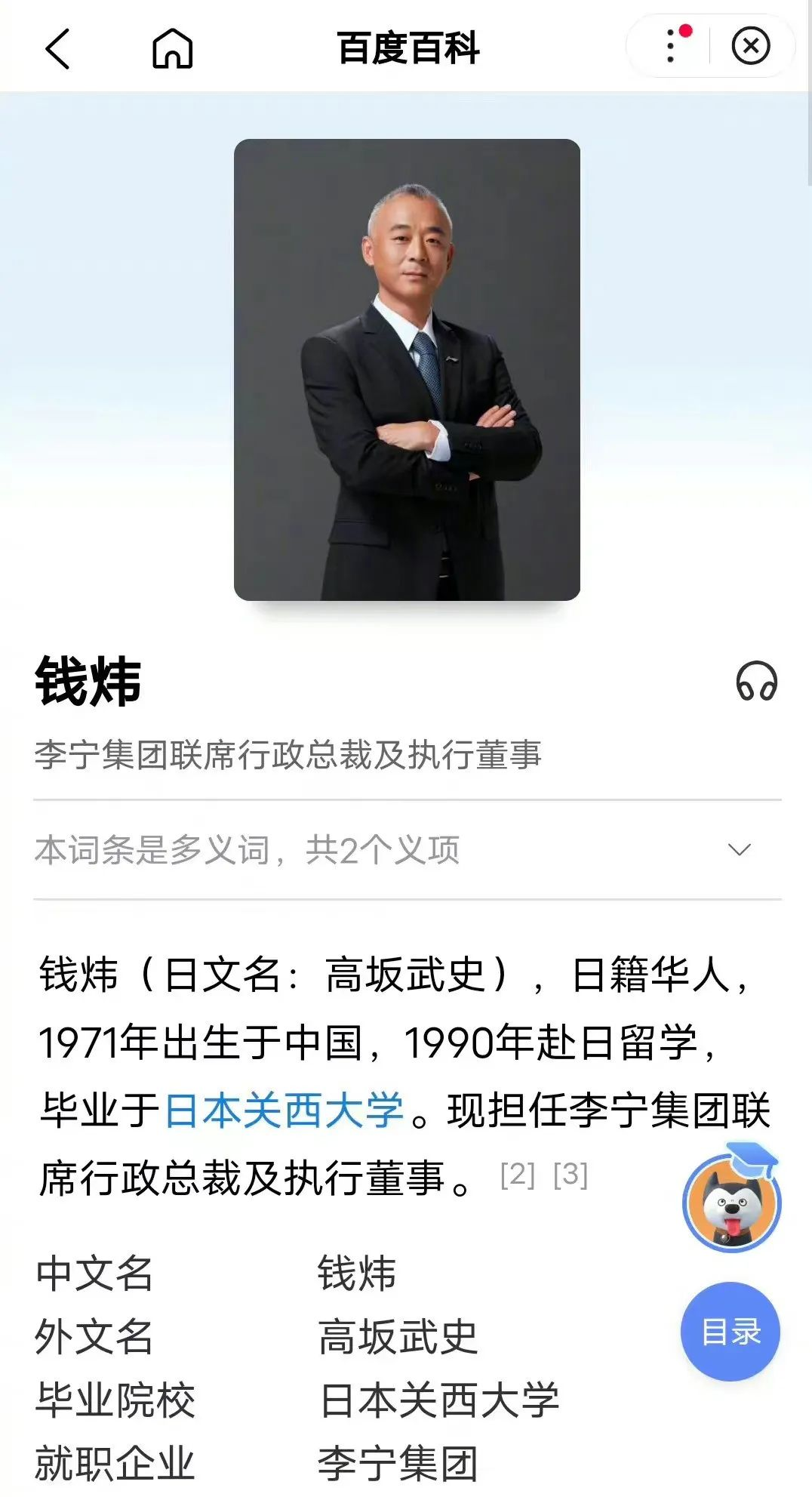 钱炜,李宁集团的现任联席行政总裁及执行董事,日籍华人,日文名叫高坂武史,李宁有限公司股东,持股0.0094%。