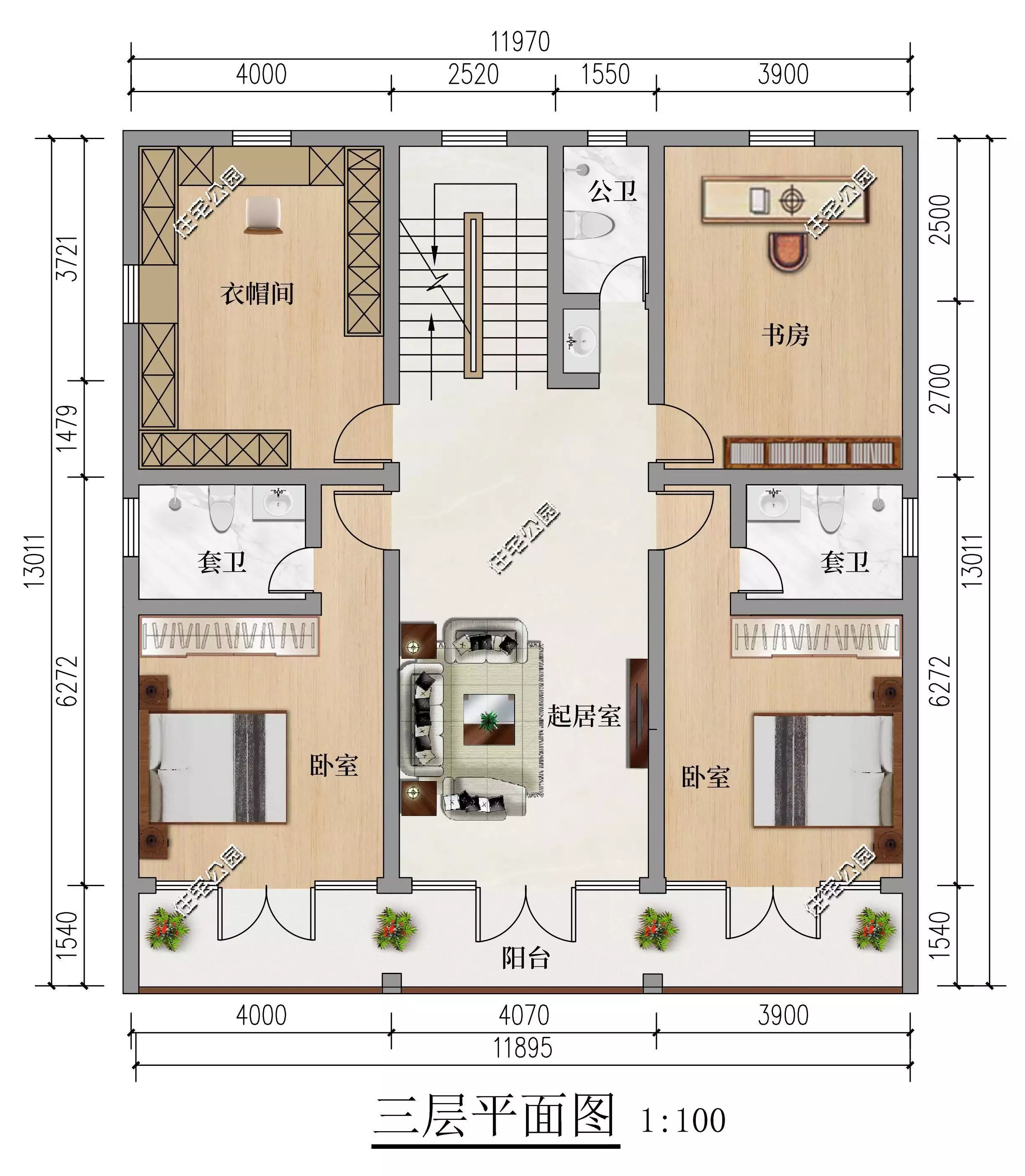 三层设计朝南双卧,提升居住幸福指数;东南西北四个方位各设计了居室,完美利用三层空间。