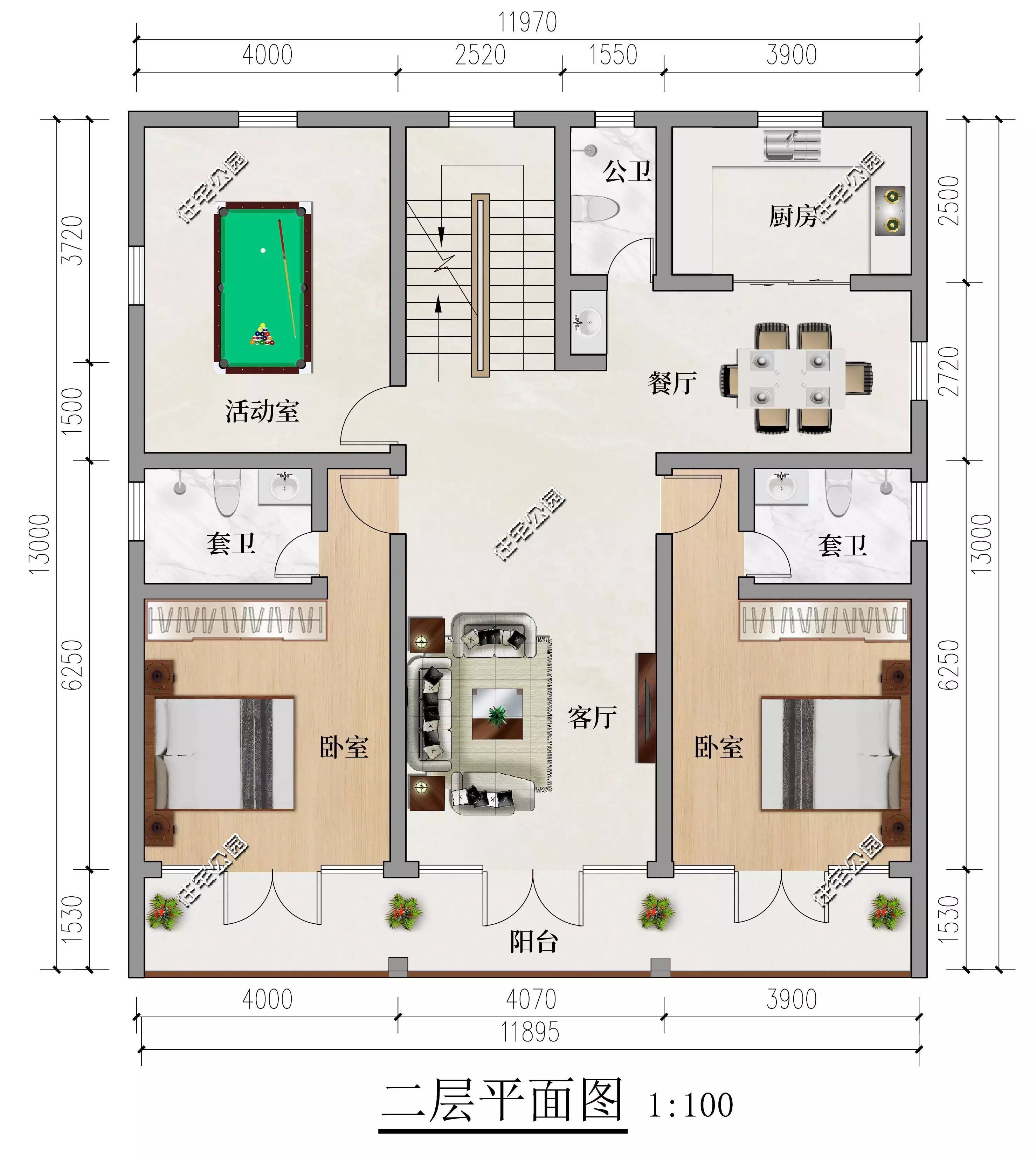 二层便是主要的居住功能房,双卧室均坐北朝南且带独立卫生间,对称设计更显建筑特色。