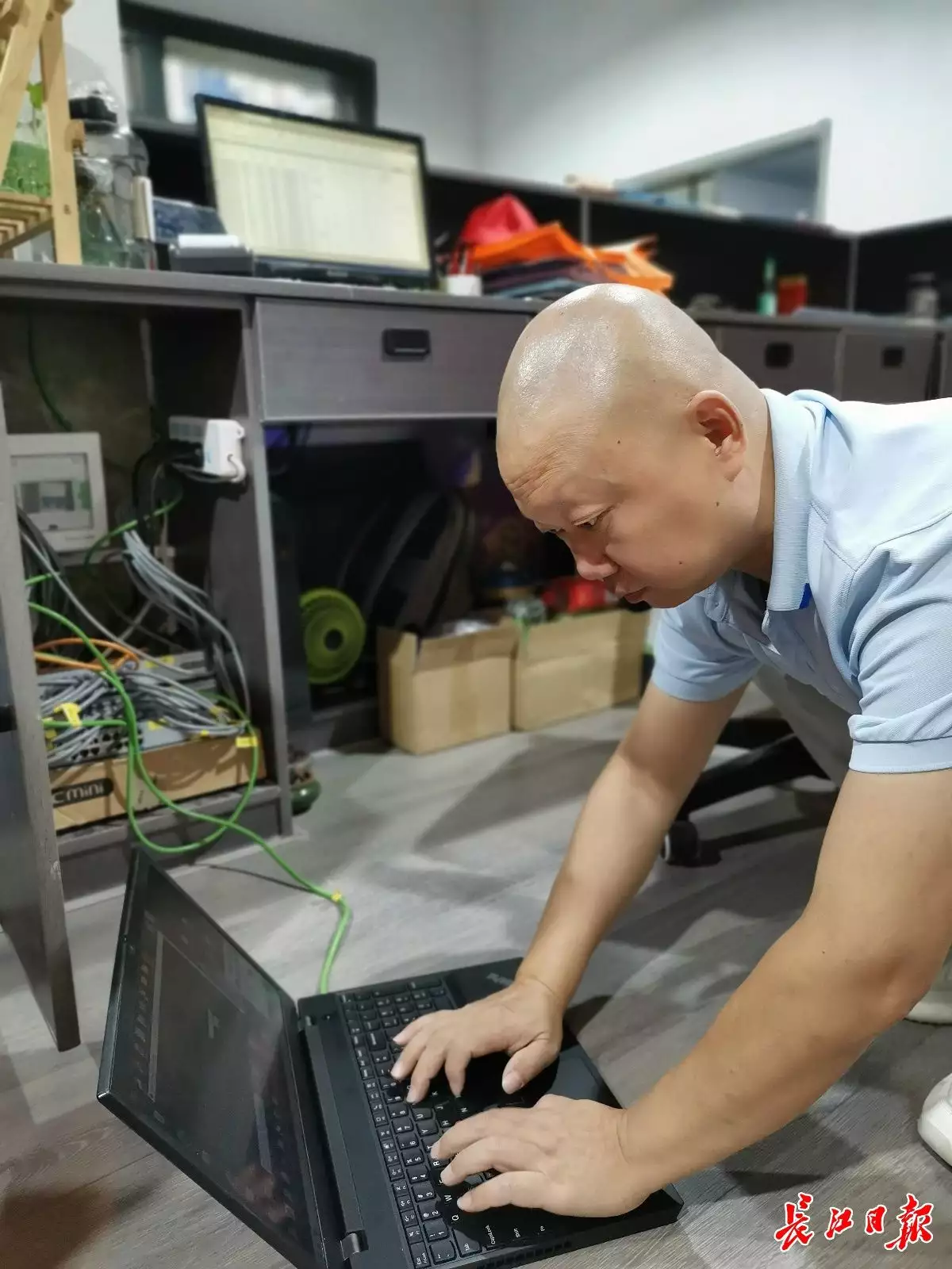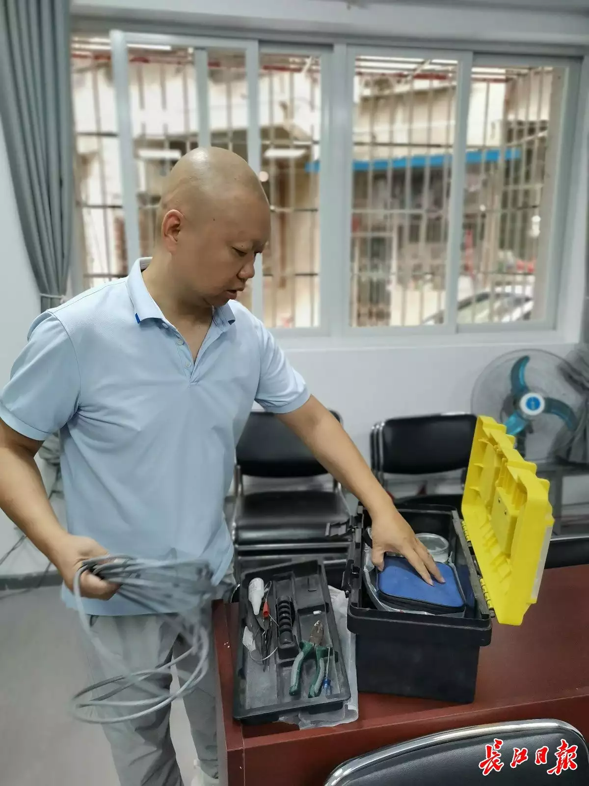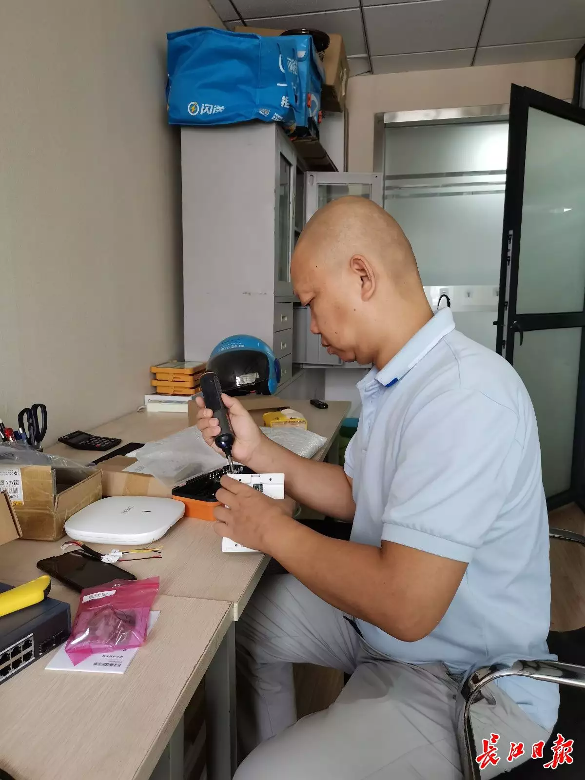 9月13日上午,长江日报记者在硚口区汉水桥街道解放社区见到易永时,他正在社区服务中心忙着布线、调试、搭建小型局域网。
