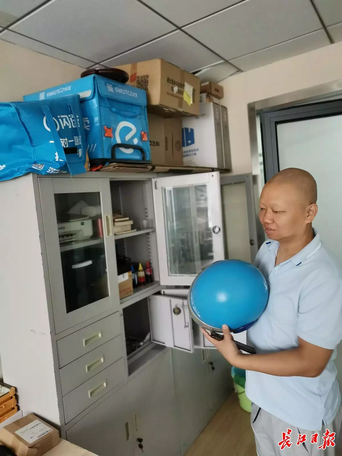 易永将自己昔日的送餐装备一直放在公司办公室。 记者史强 摄
