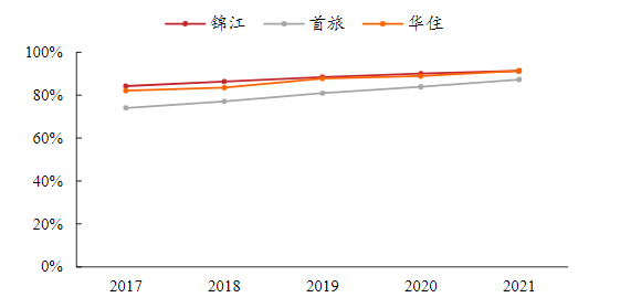 而单店利润提升的一个重要来源就是单房利润的提升。除此之外,对于品牌方而言,其利润还跟加盟店的提点有关。也就是品牌方和加盟方的利益分配问题。毕竟连锁酒店的加盟店占比在80%左右,见下图。