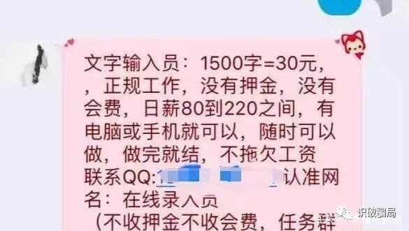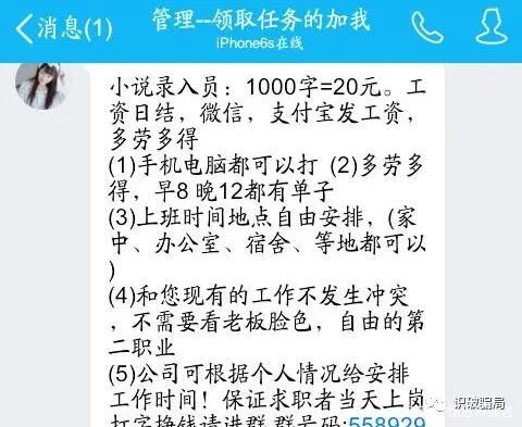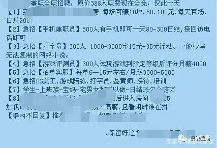 识破骗局(ID:sppj555)随着网络的发展,随着聊天软件的发达,随着各式各样的兼职工作的衍生。现在的骗局可谓是防不胜防。最近聊天群里,看到这样的消息,招聘兼职,有的日赚300元。看完心里免不了为之一动。并且很多这种信息上面都写了工资日结,这四个字想想看真的很吸引人。于是,朋友尝试了一下,加了这个联系人的QQ。