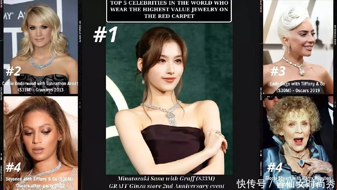 有报道称,其他世界艺人佩戴的珠宝没有TWICE Sana 佩戴的奢华。Sana穿着出席Graff日本银座店开业典礼活动佩戴的Graff项链,价值50亿日元,达到3303万美元,该珠宝包括项链、耳环和戒指,总重188.77克拉。