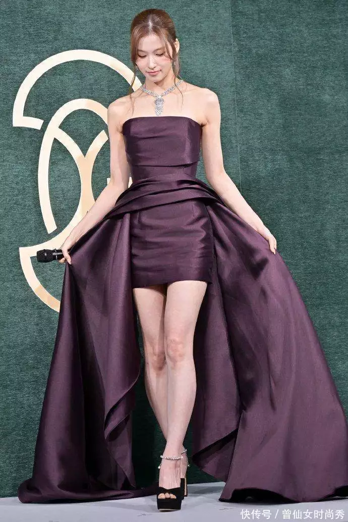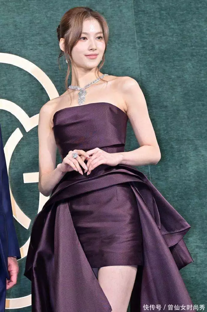 当天的活动中,TWICE成员Sana身穿暗紫色礼裙,佩戴价值高达3303万美元的闪耀珠宝亮相,无须多言的华丽贵气。