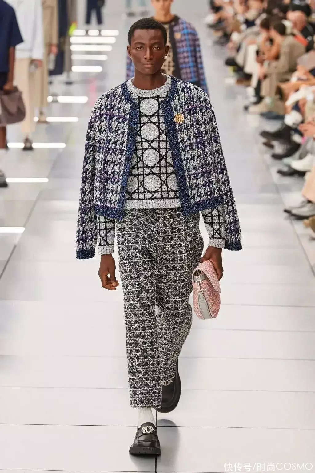 DIORDIOR 2024夏季男装系列,模特们通过升降台亮相和退场,颇有未来感。Kim Jones在这次五周纪念大秀中向品牌历史上的设计师们致敬:Yves Saint Laurent时期的精致廓形、Gianfranco Ferré时期的华美刺绣、Christian Dior时期的弧形状宝石设计,以及Marc Bohan时期的纹理图案。藤格纹成为T台上的主要元素,出现在针织衫、大衣、长裤等单品上,配合利落的流畅剪裁,整个系列呈现出优雅的气质。