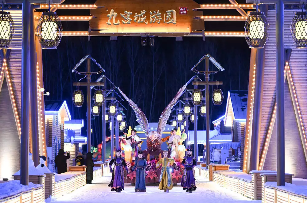 在伊犁哈萨克自治州特克斯县的“盛世华疆·九宫城游园”,夜幕降临,园内的灯光依次点亮,营造出富含中华传统文化元素的梦幻冰雪世界,引来众多游客争相打卡拍照。