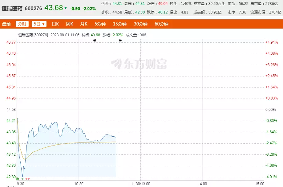 不过,此次拟实施员工激励计划发布后,截至目前,其股价表现不太乐观。8月1日,恒瑞医药股价开盘迅速下探,盘中跌近5%,随后跌幅收缓。截至发稿,恒瑞医药跌2.02%,报43.68元/股,总市值2786亿元。