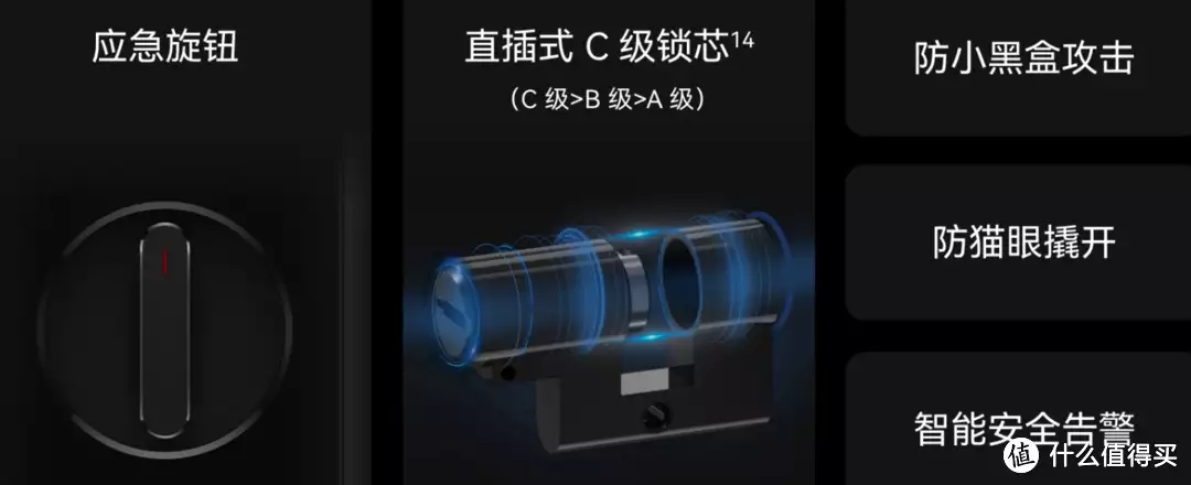还具有防错误试开报警、门未关、门虚掩报警等多重安全告警功能。另外,硬件防护方面还配备有C级锁芯、防盗刷锁舌、防猫眼开锁、防小黑盒攻击、防暴力破坏、应急旋钮等硬件保护设计。